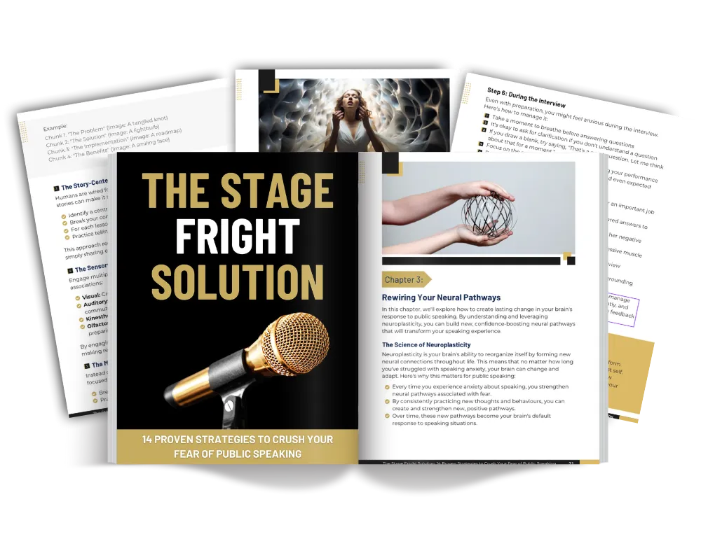 The Stage Fright Solution isn't just a collection of tips – it's a comprehensive system designed to rewire your brain's response to public speaking. We combine cutting-edge neuroscience with practical, easy-to-implement strategies that have been proven effective for even the most severe cases of speaking anxiety.