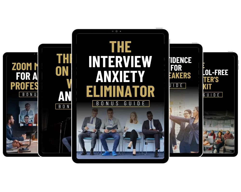 PLUS: 5 FREE BONUSES (Worth $184) including "The Interview Anxiety Eliminator" and "Thriving on Stage with Anxiety" that turn career-killing fear into promotion-worthy presence!